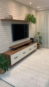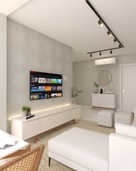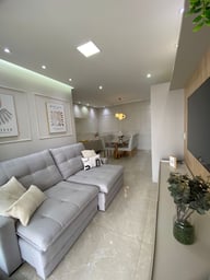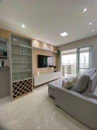 A sala de estar integrada com cozinha foi o primeiro pedido feito pelos nossos clientes, que buscavam a sensação de leveza e espaço amplo dentro de um apartamento de 2 quartos.