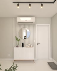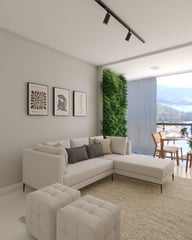 Para quebrar com a neutralidade do espaço, um jardim vertical e um painel ripado trazem naturalidade e movimento, respectivamente, para a sala.