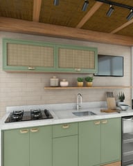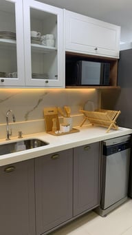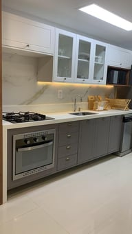 A principal essência que guiou o projeto foi a sofisticação e a leveza do estilo clássico, trazendo portas almofadadas com puxador concha na cor ouro envelhecido.